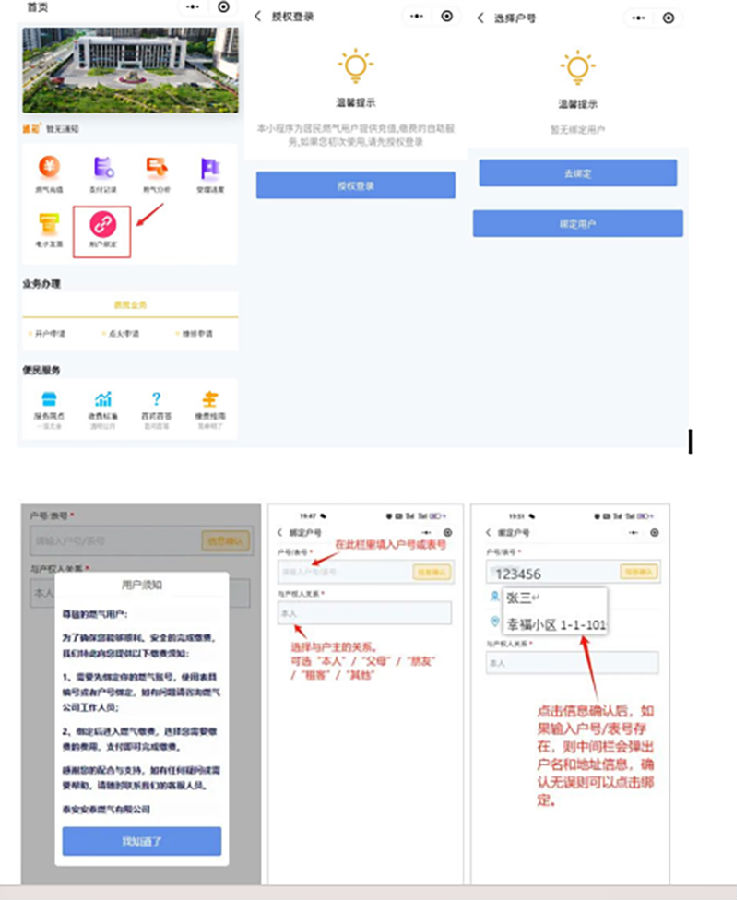 • 全部绑定完成后,点击首页的“用户绑定”可查看并切换当前登录的燃气账户。